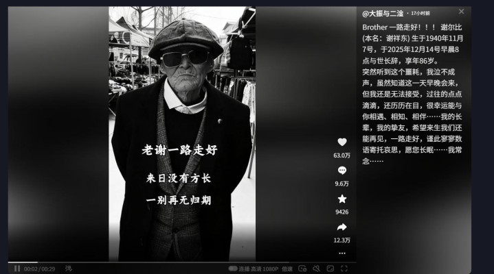 14日,领有近四百万粉丝的视频博主“大振和二淦”发布音尘称:“Brother一皆走好!谢尔比(真名:谢祥东),于2025年12月14号朝晨8点与世长辞,享年86岁。斯须听到这个噩讯,我痛哭流涕,天然知谈这一天早晚会来,但我如故无法接纳,过往的一丝一滴,还寥若晨星在目,很运道能与你相逢、相知、相伴……我的父老,我的诤友,但愿来生咱们还能邂逅,一皆走好,谨此寥寥数语委托哀想,愿您长逝……我常念……”