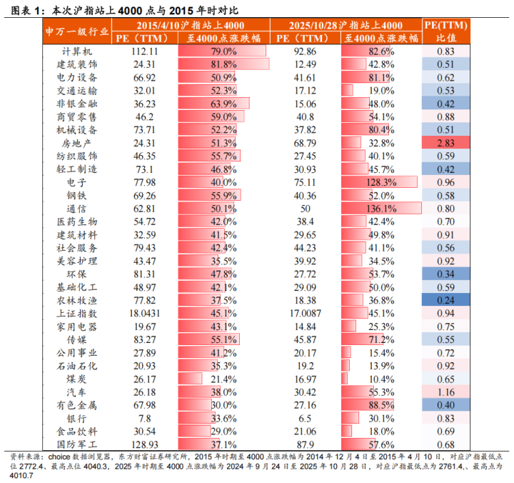 研报以为,本轮行情与前两轮显贵不同。领先,本轮行情自2024年9月24日启动至初度冲突4000点用时超1年,比拟前两轮用时更长;其次,鼓吹本轮行情冲突的最进攻力量来自以信息时刻为代表的新质坐褥力,电子、通讯、预计打算机、电力诞生等成为引颈本轮行情涨幅的主力军;临了,本轮市集行情举座以及各个行业估值水平大多显贵低于上一轮4000点水平,根蒂原因是现时中国经济质效跃升和A股市集生态重塑。