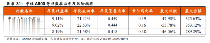 收益推崇来看,中证A500指数历史功绩优异,在市集上行行情中较沪深300具备更高高涨弹性,轰动行情中则有抗跌性,长期年化收益率推崇出色,跑赢部分宽基指数。Choice数据统计露馅,自2009年11月1日至2025年10月31日,中证A500全收益年化收益率9.11%,最大涨幅325.63%,均优于同期沪深300,最大回撤与沪深300指数相配。