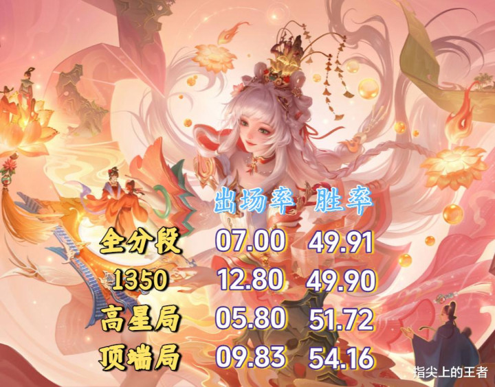 西施在巅峰赛中比较热点,且会随着段位的提高,胜率越来越高,排位中发扬只可说还行,莫得优秀到非禁必选的地步。